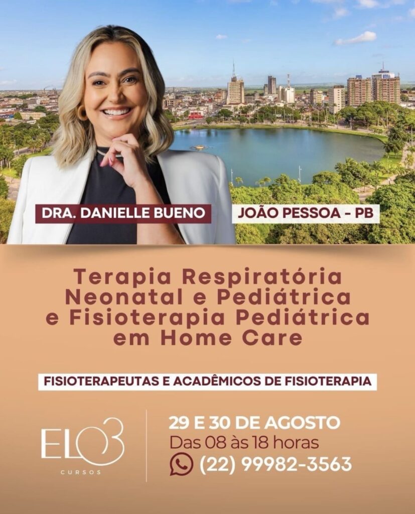 Nos dias 29 e 30 de agosto de 2026, a Dra. Danielle Bueno estará em João Pessoa, na Paraíba, para mais uma edição deste curso completo, reunindo conteúdo teórico e prático com foco em técnicas, recursos e abordagens essenciais para a atuação em Terapia Respiratória Neonatal e Pediátrica e Home Care.